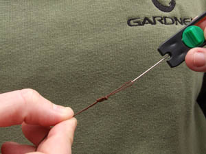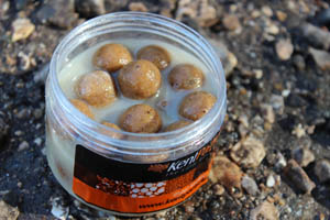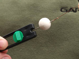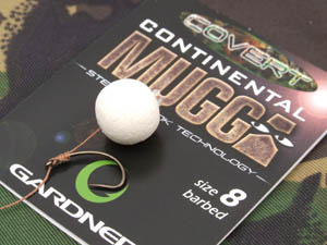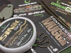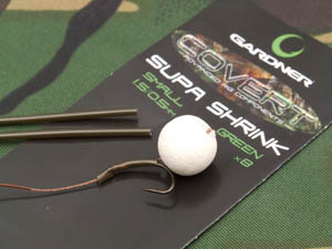 I quickly set about having a lead about in front of my chosen swim and found a nice hard silt area around fifty yards out and decided this was worth putting a bit of bait on. I baited with around 1kg of 10mm Mainline Cell and half a kilo of 15 millers rolled by Kent Particles nice and accurately to the marker float. My rigs were kept fairly simple around seven inches of 25lb Gardner Sink Skin was coupled with a size 8 Covert Continental Mugga , I then used quite a large section of the Covert Super Shrink to trap the knotless-knotted hair to the shank of the hook (see sequence) and to this I attached a 12mm White Cell pop-up. I then threaded a small Micromesh pva stick down the rig and that was job done!