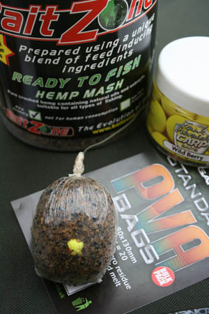 The zigs hanging off my rods were swapped for two chod rigs and a solid bag for this swim, perfect presentation with the strength to steer fish from the weed and the island to my left. I have been using 35lb Mirage for my naked chods recently which is superb, I have discovered that I can use a medium sized Line Stop’s from the Gardner Target Specimen range as the back stop and a Covert Safety Bead rests on this perfectly! I am using one of the Drop Out Chod Safety Clips to create a weak link to attach the lead, I’ve put a Covert Tail Rubber and a Covert Buffer Bead over it as you can see in the pic. If the lead gets caught up on anything while I’m playing a fish it will simply drop off. I had some prototype baits from Franks Bait factory designed for choddies that needed some testing so out they went, one on the islands shelf and one just on the edge of it. I filled a solid bag with some PVA friendly hemp mash, I put the lead and rig inside it with a small Franks Baits Wild Berry popup attached. This went out more to the right, straight into the thicker weed off the shelf.