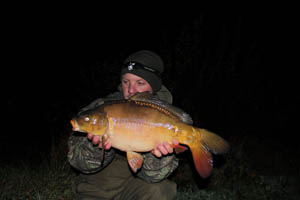 I found a cracking spot at 55 yards to my right and that was the rod that ripped off at 8pm. It was difficult to play the fish in the wind and I lost contact a couple of times in the gusts but the Chod hook held firm and one of the new stock mirrors was in the net. Only a small fish of around 10lb and I took a quick snap for my stock records. I have kept records since I organised the stockings of the commons and the mirrors for Argal. It was the only fish out that night and although It was small I was chuffed.