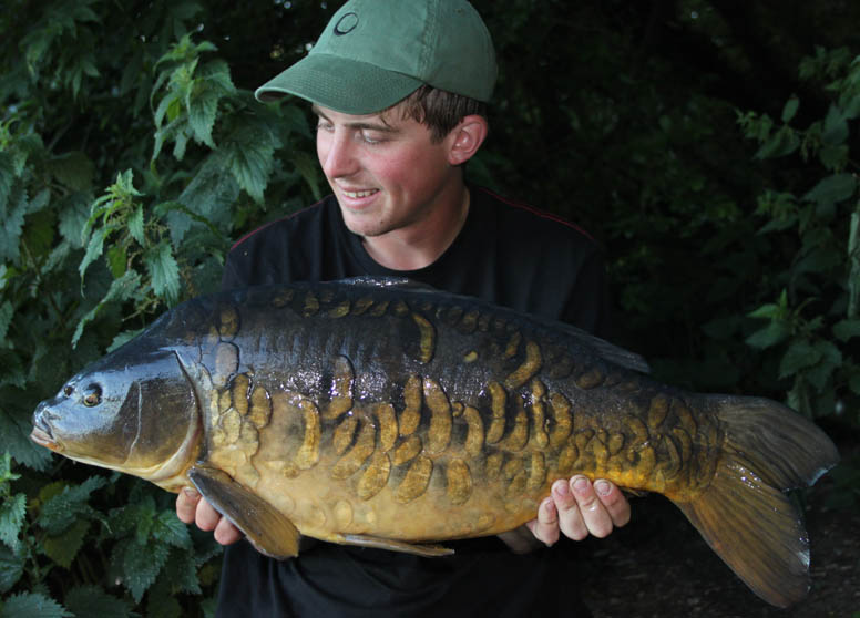 It took a while for the fish to come back but after two hours of baking in the sun they finally did return and gradually more and more. My next opportunity arose when a group of nine fish were all on the spot feeding with confidence. Five of the fish left after a minute or so but the others just kept feeding including a rather large common. They were totally unaware I was there, so I was starting to doubt my presentation as time slipped past when all of a sudden the large common froze and shook its head violently causing the inline lead to release as it tore off in to the lake. I saw the pink topper hanging from the fish’s mouth as it was ejecting the lead and upon lifting the rod I felt its sheer power and a lengthy battle ensued. The fish was adamant on charging around the snaggy corner to my left and I ended up having to get wet to keep the fish under control. A friend came to my aid and helped with the netting after turning things back in my favour and confirmed my thoughts that the fish was well over 30lb. We weighed her at 32lb 14oz and she was identified as “The Box Common” and looked stunning as we did the pictures. Before long and after a few water shots I was lowering her back and left to soak it all in as packed away.