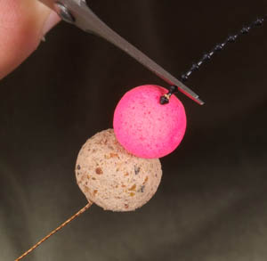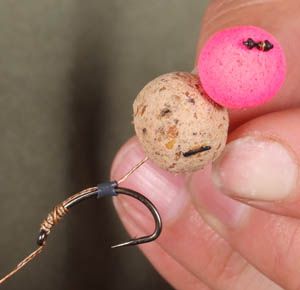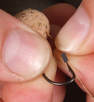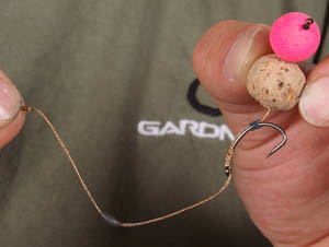 I caught a small 14lb 8oz common during the hours of darkness from the spodded spot in my main swim and I then lost one just as it was getting light. After no more action I checked the margin spot around 10am and was greeted with the sight of a spot now four times the size, completely devoid of bait and fish regularly dropping in to see if it had been replenished. I could not believe my eyes and decided to wrap my kit away and just set up a single rod with the bare essentials for stalking. I topped up the spot before doing so however in the hope it would give the fish time to notice it and start feeding upon it again. I set up a single rod with a 2 foot Plummet leadcore leader and 3.5oz Gardner Flat Pear inline lead fished drop off style with a size 8 Covert Swivel. My rig was extremely simple and made from 4 inches of brown 20lb Trickster Heavy tied with a knotless knot to a size 8 Covert Continental Mugga. I used a small piece of the Covert XT Silicone Tubing around 3mm in length to trap the hair to the bend of the shank. I baited the rig with a 14mm Cell bottom bait and tipped it off with a pink Cell pop up that I had trimmed to around 6mm in size.