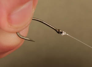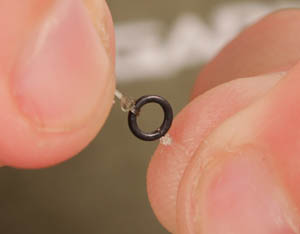 Next, tie a Large Covert Rig Ring to your mainline below the float and attach a weak link of around eighteen inches to two feet, which determines the depth the live bait will be positioned at. I generally use a mainline of 3lb when forming a weak link, and I also tie a couple of overhand granny knots in it to weaken it further. This gives the added bonus if the lead link gets snagged it can be easily broken leaving the angler in contact with the fish.