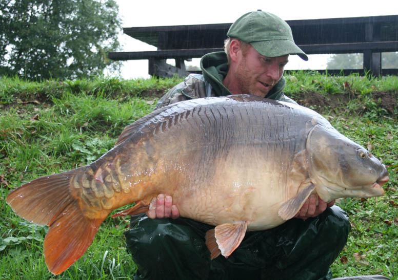When the next morning came, it was a lovely morning. The lake was flat calm and you could see fizzing in places and the odd carp stuck its head out. Over the course of the week my approach to the swim really started working, I kept the bait going into the same spots by the gravel bar and I had a total of fourteen carp, with a good mix of mirrors and commons up to forty eight pound plus a surprise orange koi carp, which was a mid twenty.