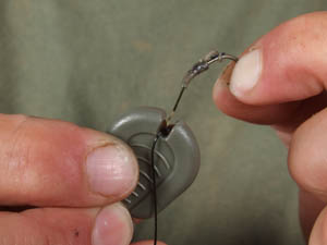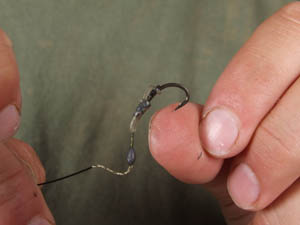 The bare bones of the rig – the thing that really sets this rig apart is that hook section. The D style method of mounting the hook bait means that the hook goes in bend first and act as the perfect pivot point should the carp try to eject the hook bait putting the point straight down onto the fish’s lip – a mechanical action that is enhanced by the gentle curve of the hook link and making sure thta the D is straight on the back of the shank…