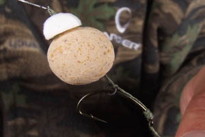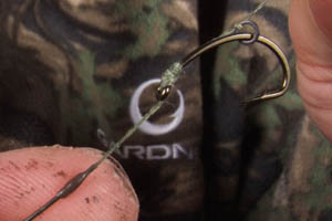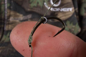 Step 4. Attached a size 8 Covert Mugga hook using knotless knot with the rig ring in this position.