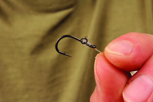 Step 5. thread on a small Covert rig ring and pass the tag end back through the eye of the hook.