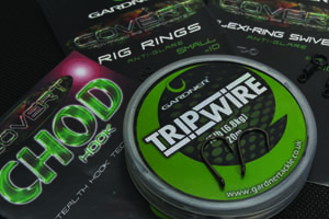 Step 1. Start off by threading the Trip Wire through the eye of a Chod Hook this way.