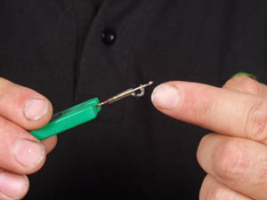 Step 4. Mount a large Covert Rig Ring onto the preformed ‘D’ and use a Braided Hair Needle and thread onto the hooklink.