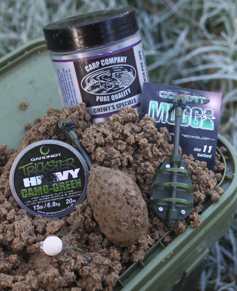 Another way of searching the water with just a mouthful of food is to use large flat bed method feeders, something else I have taken from the carp match fishing. It allows you to search out the swim very easily and can be easier than solid bags especially when conditions are wet. Traditionally ground bait is used on the feeder as there is not much actual food content within it. Instead it is packed with flavours and attractors and can be boosted further with your chosen liquids. My advice would be to avoid liquids with a high oil content as the fish find it much more difficult to digest in the winter and it will often cause them to sit digesting it for an extended period of time. Something else I have done extremely well on is using scalded pellets to mould around the flat bed feeder. I like to mix it up a little at a time on the bank as I go as I like to cast it out whilst it is still hot. The heat of the bait can sometimes spark the fish in to feeding when they would otherwise not and the boiling water also helps to thin the oil within the pellet and speeds up the breakdown process. I like to use short 4 inch rigs made from 15lb Trickster Heavy as it is very supple and acts naturally as it falls away from the feeder when disturbed. My preferred hooks for both the flat bed feeder and solid pva bag approach are size 11 Covert Muggas. The aggressive angle of the Mugga seems to work so well when coupled with short supple rigs.