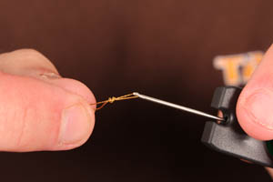 Step 3. Add a hair stop to keep the bait in place. Using a simple knotless knot whip down the hook shank. We prefer a short hair.