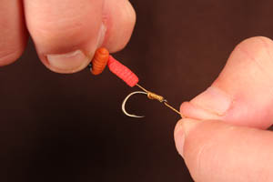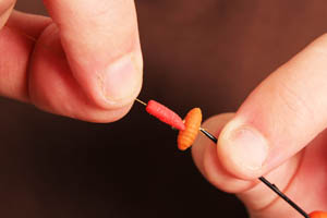 Step 2. Mount an imitation buoyant maggot length ways and a buoyant caster sideways, this creates a ‘T-shape’ hook bait.