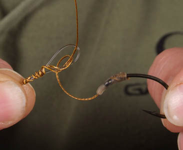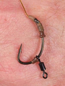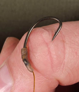 Recently I have been having great success using a combi-rig presentation using a stiff boom section called Trick Link and a short supple section tied with Trickster Heavy. The boom section is around 7-8 inches in length and joined to a very short section of supple braid. The hookbait is tied to a size 12 Covert Swivel, which sits on the shank on the hook sandwiched between two Covert Hook Stops. My favourite pattern of hook for this presentation is a Covert Continental Mugga. To finish the rig off I add a Covert Hook Aligner over the eye to enhance the aggressive angle of the hook. A large dollop of Critical Mass Putty covers the Albright knot (the knot used to join the stiff boom section and the supple section of braid) and acts as the weight to hold the pop-up to the lakebed. The pop-up sits less than two inches off the lake bed and is effective as a single bait presentation or over a bed of bait.
