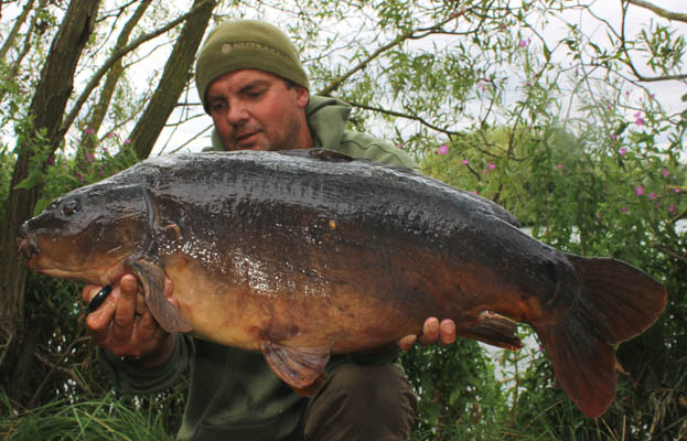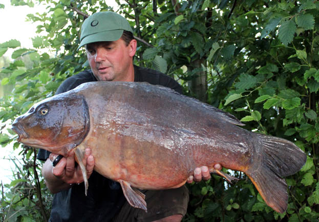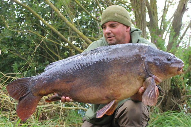 Before I had a chance to get everything ready, to my surprise my other rod burst into life! I looked down at my un-made up landing net and quickly thinking on my feet, I set the clutch and dropped the rod back in the rest with a nice curve in the tip. Quick as a flash the net was assembled and I was back in action. This fish gave me some right fun and games, before rolling into the waiting net. As I parted the mesh, I was greeted by the sight of a very solid old mirror with a slight two tone look about it. It weighed 32lb 10oz and really took some holding for the self-take photos (like holding a slimy overgrown melon, yes that solid!).