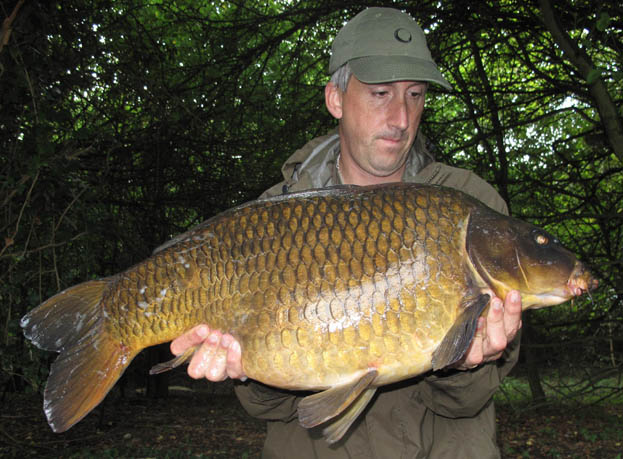 Once the rain had stopped the lake suddenly seemed to come alive as fish after fish crashed out. The only thing was they were everywhere, with no discernible pattern as to where they were showing. One would lump out in the bay behind me, only for another to show straight after right up the other end. This began to play on me, as it was difficult to see the wood for the trees, and I began to wonder if I was missing something by not moving. It was one of those occasions where I had to just sit still and let it all go on. It definitely seemed that the period between 5 and 7am was the time though, as after a very quiet night I was in again on the same rod and back out in the boat, trying to extract it from a weed bed the size of a small car. Once the weed was off the line I could see I was attached to a golden common that seemed to have a bit of ghostie in it. At 25lb it was another result on a short session and a new fish too. I packed up and quickly hung up the wet mat and sling in the garden before rushing off to work.