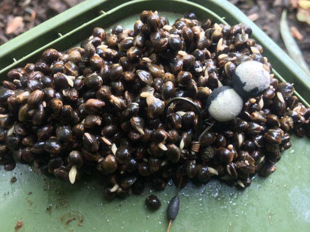 Another tip is to collect a sample from the spot, by simply digging in the handle or raking over the lake bed surface and carefully bringing it up to the surface, which can often reveal secrets like natural food larders such as bloodworm beds or other aquatic life. Clay spots are a favourite of mine, which carp are renowned for flanking on for mineral absorption to aid health and well-being. These are a reason for carp to visit the spot even before application of pre-bait.