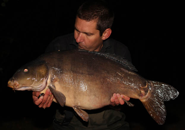 The right hand rod bleeped a few times as a fish made a mistake with the balanced hookbait and a bow wave appeared to my right as a fish swam diagonally across the front of the swim (the super light Nano Bug being held up tight to the alarm by the weight of the Mirage). I picked the rod up wound the slack up and all hell broke loose as a decent fish stripped 40 yards of line off the spool as I struggled to get the leaky old chesties on…
