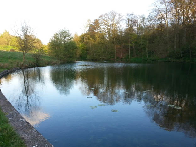 This 2 acre, oval shaped lake has a tree lined bank on one side and an open grass bank on the other with an outflow at one end. As summer arrives the lily pads coming up and cover two thirds of the lake, which poses a real challenge when playing fish. The lake is only 2 feet deep, crystal clear with a very silty bottom and some heavy weed beds. The fish like to move through channels and gaps in the pads.