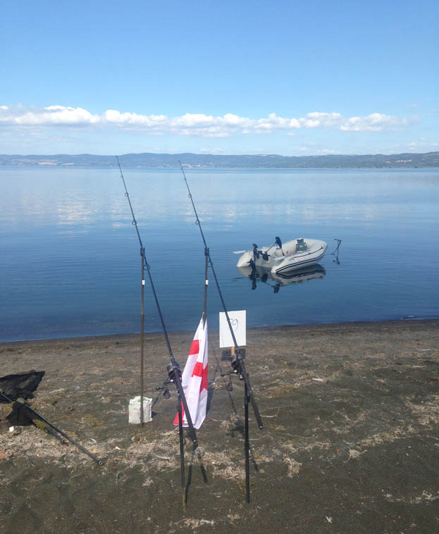 The day finally came and myself, Graham Mabey and Alan ‘Longshank’ Pagett were sat with a smug grin as we flew in to Rome airport, but it didn’t take long for that to get wiped off! We had arranged and paid for an estate hire car with a company and I was to be the named driver, however when we got there they wanted a credit card to hold on the system. I don’t own a credit card and only had my debit card and no matter how hard we pleaded our case they wouldn’t budge even after we offered them 1000 euros in cash to hold for a week! This was a massive buzz kill but after a quick call to Ross Honey we headed to the train station and after two changes we arrived around twenty minutes from Bolsena in a local town. Our team captain and all around good bloke Hans had kindly come and picked us up and after around ten minutes we finally caught our first glimpse of the stunning and truly massive Lake Bolsena before arriving in bivvy city.