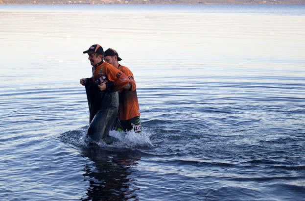 We had also positioned that rod right on our boundary in slightly deeper water as we had spoken to Hans and he said they could only get bites in 8m of water and the deepest we had was 7.5m on our boundary, so needless to say the short rods were both moved out long on the same tactics. On Friday morning the media team arrived in our swim and wanted to do some interviews and stuff so just as we had all been lined up and the camera had started rolling Graham’s rod we had moved long tore off at an alarming rate! I put on mine and Graham’s life jacket whilst Pagett prepared the boat and net before we climbed in and Pagett gave us a big push out in to the fierce waves that were crashing in. I lowered the prop and as I started it all hell broke loose as a big wave swept us in to my two lines which were now all tangled around the prop. I had to cut the lines and hand them to Pagett on the bank so he could pull them in whilst I tried to untangle the line from the prop. To do this I had to undo the cap and take the propeller off whilst Graham was slowly reeling us out to the fish and as a massive wave nearly knocked me overboard I dropped the screw cap that held on the propeller! I was really angry and frustrated by this point, but I tried to stay focused and pulled up the outboard and started rowing like my life depended on it to get us out above the fish. Around 100m from the bank our line was stuck in a weedbed but the fish was still the other side of it and the line wouldn’t budge despite our best efforts. Before long the fish was also in the weed below the boat and we were pretty sure it was a very big fish possibly over 20kg. The fish and weed was now inch by inch slowly coming when all of a sudden the leader went on what we think was a sharp snail in the weed.