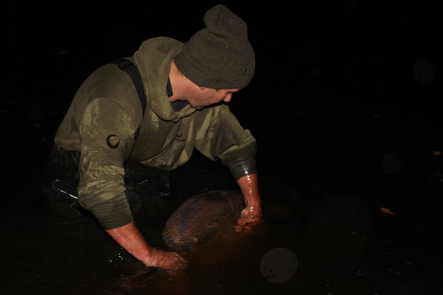 Every fish you hook is a real adrenalin rush, as the stock is so monumentally huge (in size that is not in numbers) and having come through a lean spell I was particularly anxious to land whatever was dragging me all over the swim. Slowly, and with great care I cajoled the fish closer and closer through the murky, windblown darkness (new moon +1 with wind and rain meant it was as dark as anything!). I sensed she was very near and my first attempt to net the fish simply ended with the fish touching the landing net arm and swimming off 15 yards.
