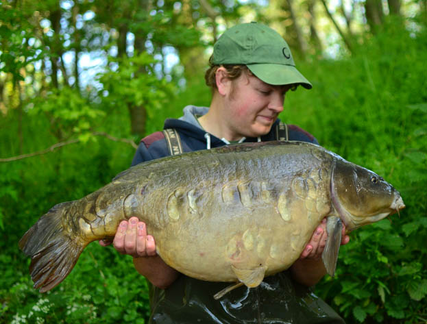 As the sun rose high into the sky, all signs of feeding fish on the main spots had died off so we reeled in to go and check on margin spots. The first spot we checked had at least a dozen or so tails up already so we quickly threw a bit more bait in before legging it back to the swim to tackle up a rod! A short hooklink made of 25lb Sink Skin was whipped to a size 6 Covert Mugga and a 5oz inline lead completed the set-up. It was Andy’s turn first, and before the lead had hit the bottom a 24lb mirror snaffled the XXX wafter. Fortunately not too many of the fish has spooked, and half an hour later there was 3 big fish tails up again, and this time it was my turn on the rod! Within 5 minutes the clutch was screaming as a fish made its mistake. It was obviously a big fish, and after a long dogged battle up to my chest in lake water it was in the net. Weighing in at 37lb 14oz it was my biggest ever common and the lake record common at the time.