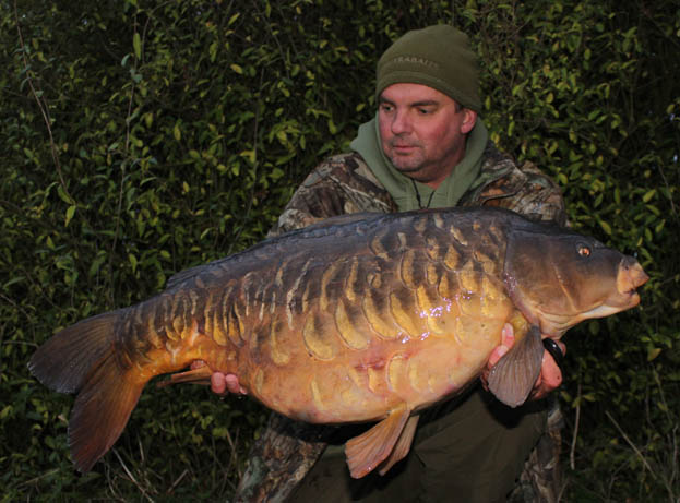 After finally dropping off, I awoke at first light to a cold nip in the air and all seemed quiet as I set about putting the kettle on. Before the kettle had a chance to boil, I had a series of bleeps as the bobbin pulled up tight and slowly dropped back. I felt it was a little strange and as I stood by the rods, I watched carefully and saw the line twitch as the bobbin tried its best to settle again. Not taking any chances I picked up the rod to be greeted by a surge of power running in the opposite direction as the fish tried to reach the nearest weedbed. I was soon playing a fish along with a big ball of weed and I could feel that horrible grating sensation as the line made contact with snail shells that the weed was covered with. The fish ploughed through the back of the weedbed and with shaking knees, I soon managed to coax the fish safely back. As the fish settled down, obviously with a clump of weed over it’s head, ten yards of steady pressure and they were both landed safely and engulfed in my waiting net (weed and hopefully a carp!). After uncovering my prize through the mountain of weed, I was over the moon to see her dark flanks catching the morning light. Looking down into the net I was sure I’d landed a big 30lber and what a stunner too! After a careful weigh she went 40lb 9oz, which was more than I’d hoped for from a December session. Like anyone I was buzzing and skipping around like a big girl. With a handful of 40’s in this lake, I’d waded through 98 carp since June and not managed to find a real big fish, well till now anyway! I’d stalked over thirty odd 30lb plus carp from the water, however I wasn’t complaining! With the fish gently slipped back and left sat sulking in the weed, I had a word with Nick who runs the water and it turned out it was a new forty for the lake! I had to laugh as I still hadn’t managed one of the known 40’s after all. On the plus side I had the pleasure of naming the beast and because she is one, I went for the name ‘Peach’. What a stunner she is and not one that visits the bank too often either.