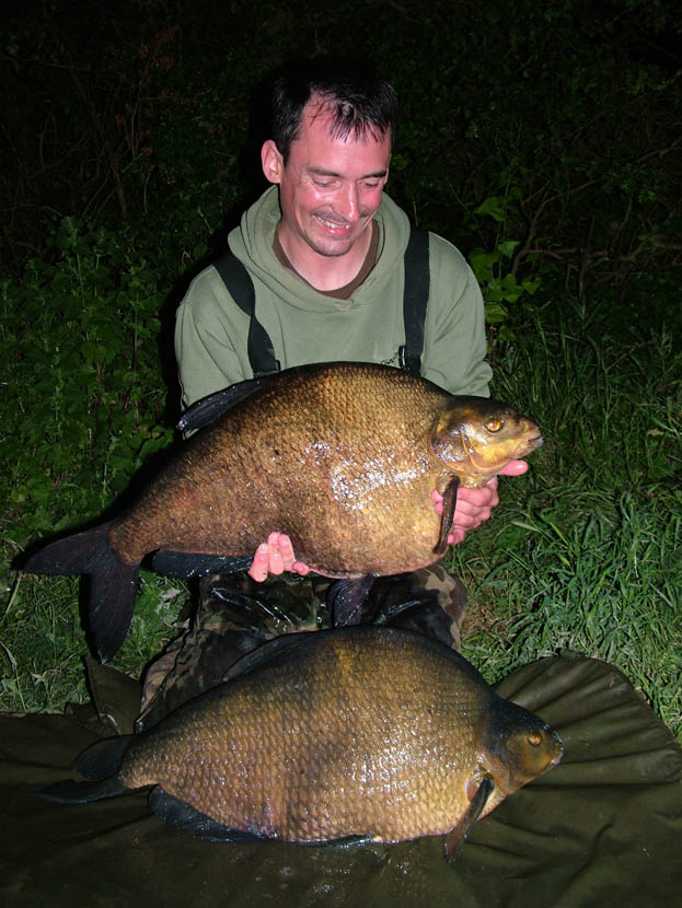 As dusk loomed several big bream rolled off the back of the baited area and it looked good for a bite. An hour into darkness, the bobbin on the middle rod dropped like a stone and after picking up the rod, I was soon playing what I knew was a big bream. Gently coaxing the fish in, I soon slipped the net under it and after parting the mesh I was greeted by the sight of a very big bream. After carefully removing the hook, the scales read 17lb 6oz and a new PB to boot! I slipped the fish into a retainer for a few minutes to recover and minutes later the left hand rod pulled up tight. After connecting with another good fish, the indicator on the remaining rod pulled up tight before dropping back and my initial thoughts were I had gone round my other line. That was until the line started to move right. I blanked this out of my mind and tried to concentrate on playing what was obviously another big fish. I was relieved when I slipped the net under it and after securing the net, I quickly dealt with the remaining rod, which resulted in a smaller sample around 10-11lbs. Remembering I still had a fish in the net, I placed what was obviously another big fish on the mat. This time the scales read an ounce smaller than the first fish and at 17lb 5oz made for a great brace.