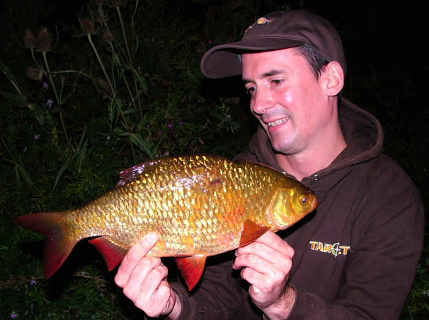 I headed to Frensham, which is renowned for its big rudd. The venue didn’t disappoint and I landed a number of fishing weighing over 2lbs, before the news broke out of some monsters being caught from a lake in Kent. The following weekend I made the long drive and as it was my first trip to the fishery, I spent several hours walking around trying to find the fish. Once I was happy I had located what I was looking for I got set up just before darkness fell. Using standard float fishing tactics with a small betalight to illuminate the float tip, I took a couple of good fish just into darkness, resulting in two pristine fish weighing 2lb 5oz and 2lb 7oz. Both these fish took a piece of sweetcorn fished two thirds depth, whilst spraying regular helpings of maggots and hemp. I had to wait until just after midnight before the float sunk again and as soon as I struck into the fish, I knew it was in a different league. After a great fight and several nervous moments when the fish made a weedbed, I soon slipped the net under a monstrous rudd. The scales read 3lb 5oz, which set a new PB in the process.