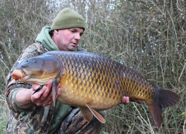 As the night rolled by at 1am I had a few liners, first on one rod then on the other (fish passing through I thought?). With a guy fishing round the other side of the island, it came as no surprise the next morning, he told me he had a carp just before 1am, which sounded about right after the liners. Reading between the lines on captures and shows, patrol routes aren’t that hard to figure out. I always make notes of capture times (others as well as my own) and shows along with the weather patterns. Feeling confident throughout the day, my lightly peppered spot on the island bar burst into life just on tea time. After a spirited battle, a 26lb common was carefully unhooked on the mat. I do love a common and even more so in their full winter colours!