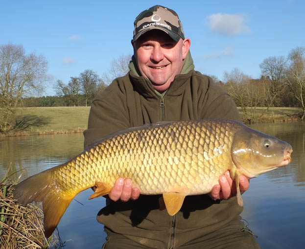 It was midday before I saw any signs of fish when I received a small liner on my rod cast to the area of spodded pellet and boilies. On closer inspection I could see that there was some bubbling over the spot and it looked as though a bite would come sooner rather than later, however, nothing materialised and the liners eventually stopped. With this in mind I decided to put a couple more spods over the spot and change my wafter hookbaits from white to yellow. Within ten minutes of doing this the liners started again and after a further twenty minutes my right hand rod was away! After a short but spirited fight I slipped the net under a lovely low double common, a very welcome guest on what was proving to be an extremely cold day despite the winter sun doing its best to add a little warmth to the proceedings.