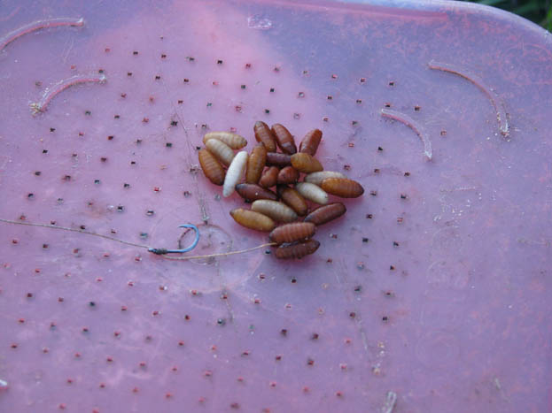 Maggots are easily presented in that finest of maggot depositing devices, the swimfeeder. Available in several guises, my personal preference are for the type as demonstrated by Darran Goulder in his Tench articles, the super sci-fi streamlined ones! The payload held with these little plastic angels is plenty for a 20 minute plop into a likely looking spot. Fished with the ever reliable mag-aligner, again using the Enterprise grubs, size 12 Covert Talon Tips or size 10 Covert Muggas depending on how many maggots I feel like offering them. Another advantage is that it eliminates the need to tie bags of maggots, which although not necessarily time consuming or that expensive, can be a bit of a burden when wandering about the bank looking for likely spots. Plus you can rebait and recast quicker than if you have to mess about tying bags to lead loops or whatever your preferred method of attaching them is. This is where the maggot clips as shown a couple of months ago are really useful if you intent to pursue the mag-aligner purist route and remain faithful to the PVA. If I feel that I am really scratching for a bite from anything, even a suicidal roach or chub to get the ball rolling, I will drop down to a size 14 spade on a 6lb or 8lb braided hooklink. Again, think big fish and know that a 4lb hooklinks may possibly let you down. Nigel’s piece on maggots last month got me thinking, and it wasn’t long before I tied up a couple of his anti roll bar maggot rigs as demonstrated in the article, I have yet to try them in anger but they look good in the test tank, lets hope the Barbel think so too.