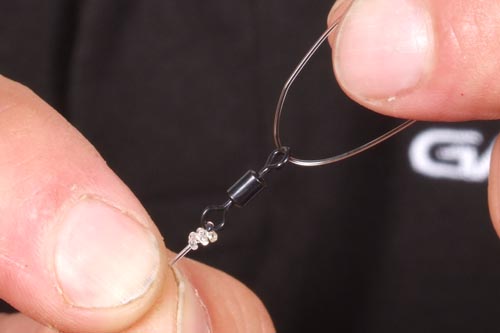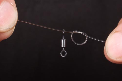 Final 2. Use a simple 3 turn Blood Knot (blobbed to secure) to attach the hook section to the Mini Rig Swivel on the end of the boom.