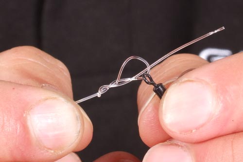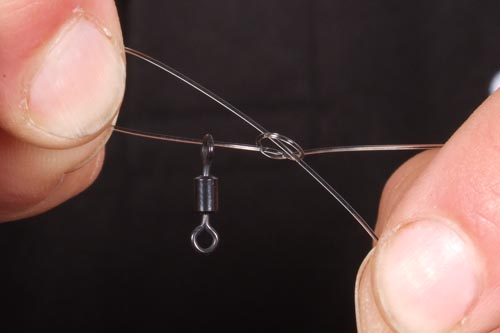 Boom 2. Start with a simple Overhand Knot, thread on a Covert Mini Rig Swivel and pass the tag back through the overhand.