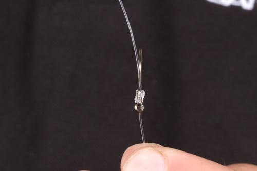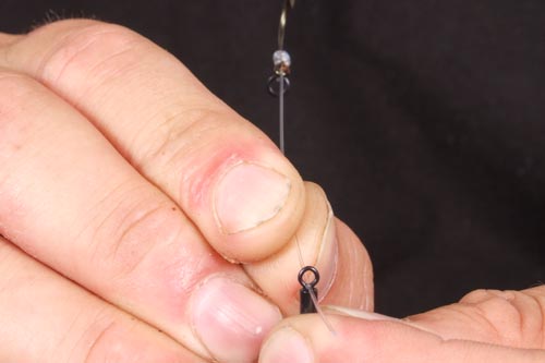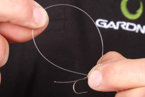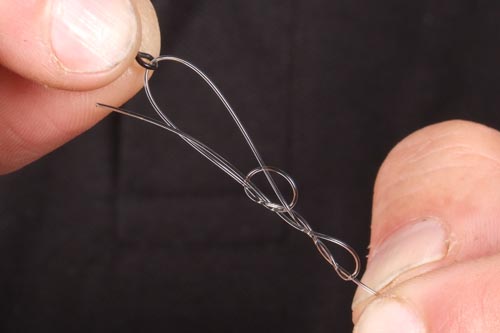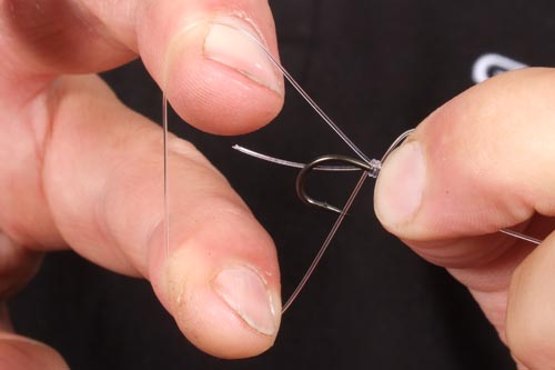 Hook 1. Pass a stiff hooklink material (we’ve used Trip Wire) through the eye from front to back and create a large loop, a few inches in diameter.
