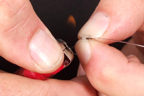 Hook 7. Make sure that the ‘D’ sits squarely on the back of the hook shank and then blob the tag end with a lighter to ensure that the ‘D’ is secured.