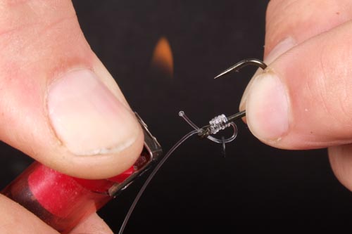 Boom 3. Wrap the tag round the hooklink several times and pass back through the Overhand Knot again, Blood Knot Style.