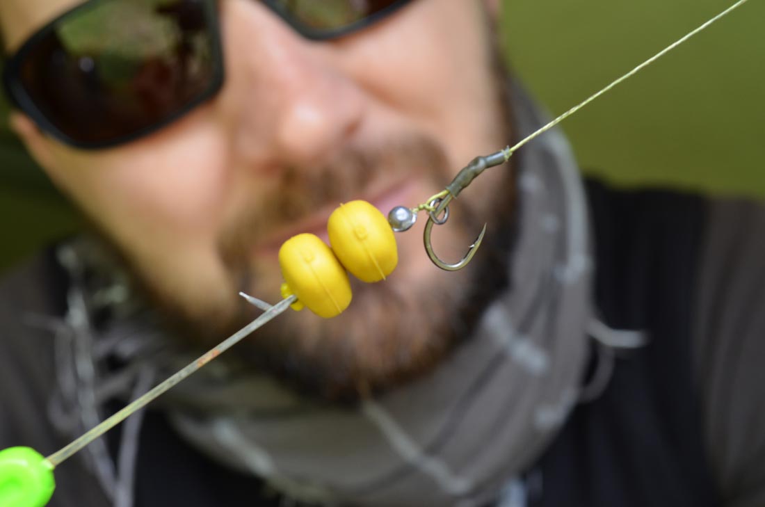 L’autre se compose d’environ 40 cm de cette même tresse, j’utilise cette longueur pour contrer les stéréotypes du bas de ligne standard, compris généralement entre 15cm et 25cm. Une bille dense auquel j’ajoute un faux grain de maïs artificiel coiffe ainsi mon piège.