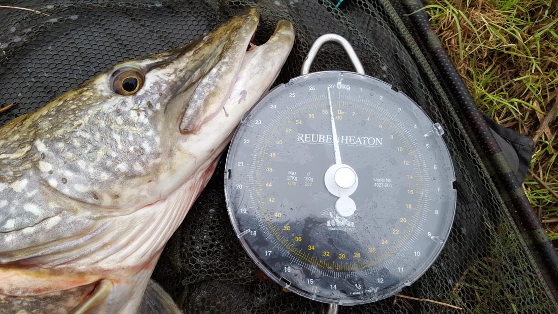 I was disappointed but also more determined to get it right and catch and was confident that with two quick bites more would be forthcoming. Over the course of the next hour my net was finally graced with two lovely river pike. First up was a low double that took a liking to my paternostered Joey out in the flow, she was a cracking fish and I gave her a big thank you as she was unhooked in the net and sent on her way. The second fish was of a much better stamp and came to my static fished margin rod. She gave one hell of a fight in the deep water and I was convinced she’d go over 20lbs when I first saw her in the water, such was the frame of the fish. However her frame belied her weight – but at 18lb 8oz I was over the moon to catch such a cracking pike. Interestingly, she had obviously been feeding heavily in the receding waters as she was very fat and I could actually feel what I suspected to be chub in her stomach so she must have been very hungry indeed.