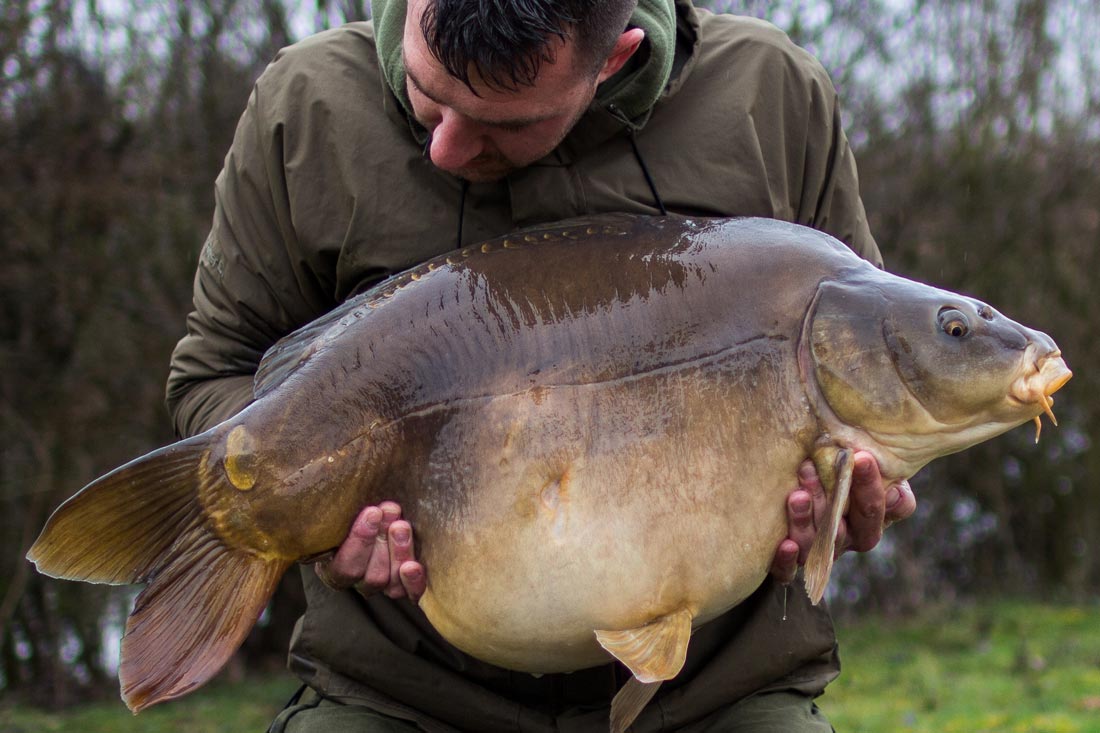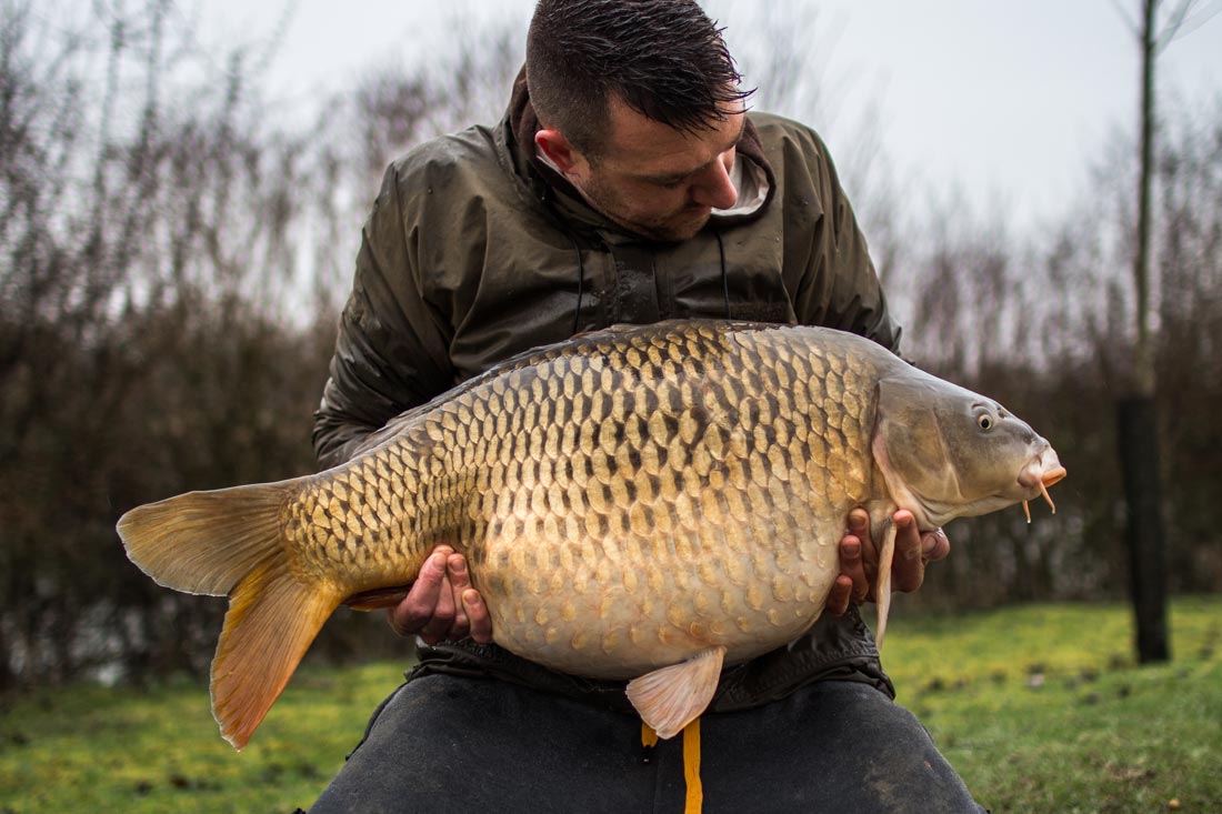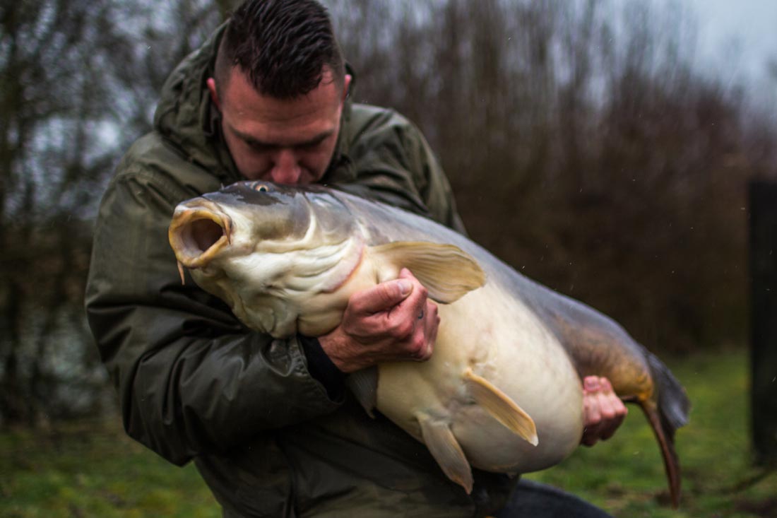 Pas in de avond wordt het wat rustiger en als snel volgt er snelle schub. Het is te vroeg om de vis te zakken en te nat om te fotograferen. We zetten deze karper dus maar snel weer terug. De hengel wordt voorzien van een frisse onderlijn die wordt uitgevaren met een volle voerboot vol smikkelmix en veel maden. Niet veel later liggen we bij te komen van al die die ruwe weersomstandigheden van overdag. Totdat er plots een aanbeet volgt. Bij het aanslaan weet ik al direct dat het een serieuze vis is! Ik vrees zelfs een meerval, want deze vis blijft maar gaan. Dit gevoel beheerst vooral mijn gedachten en ik ben inmiddels knap zenuwachtig wanneer de vis eindelijk onder de kant komt. Wanneer ik het hoofdlampje aanklik verwacht in een dikke zwarte meerval te gaan zien, maar verschijnt er tot mijn grote verbazing een bak van spiegelkarper aan het wateroppervlak. Beetje bij beetje komt de kolos dichterbij. Wanneer ik het net ophef ligt de vis er wel in, maar hangt de staartpartij nog op het netkoord! Als ik het net optil moet ik zelfs extra kracht bijzetten en dan weet ik dat ik hier te maken heb met een nieuw persoonlijk record! Terwijl we de vis in de sling stoppen, verkeer ik een soort van emotie die me bijna tegelijk laat juichen, huilen en schreeuwen. Ik ben aardig ‘over the moon’ en zie dat de wijzer van de weegklok zelfs over de 30 kilogram heengaat. Dit had ik nooit durven dromen.