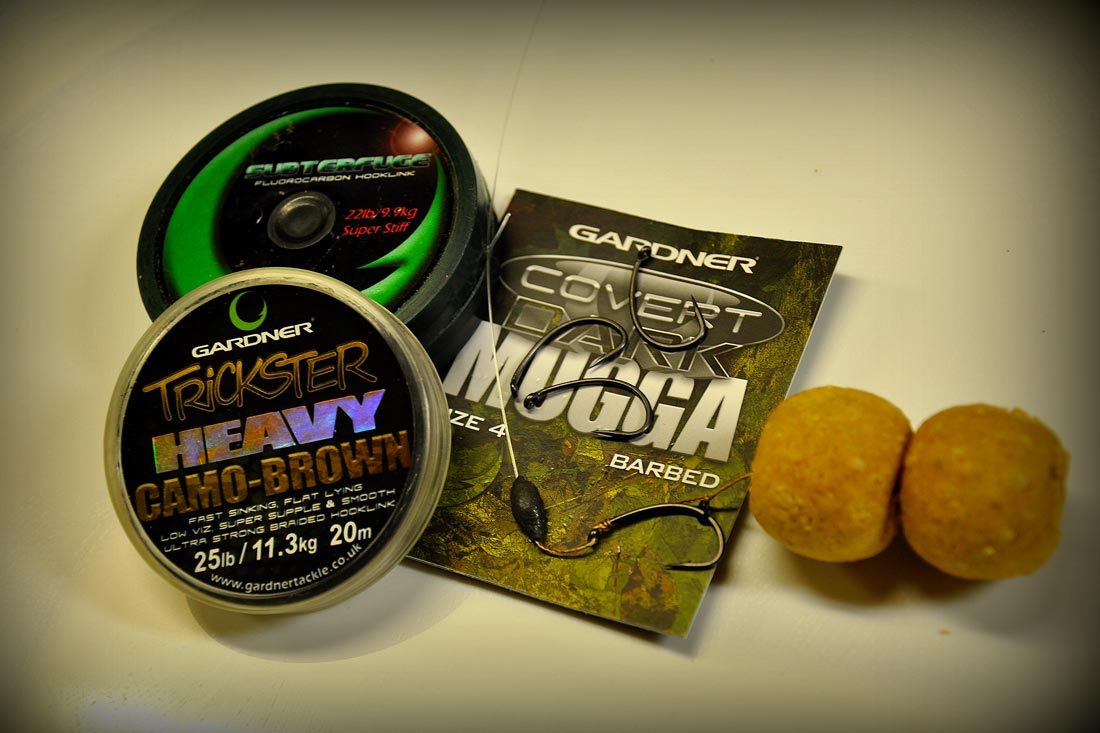 De Gardner HydroTuff wordt op de lijn gespoeld ,voorslagje van de sure shock 50lb en een combi-rig geknoopt met trickster heavy camo Brown en subterfuge stiff 22lb ,afgewerkt met een O-ring en superscherpe mugga maat 4.