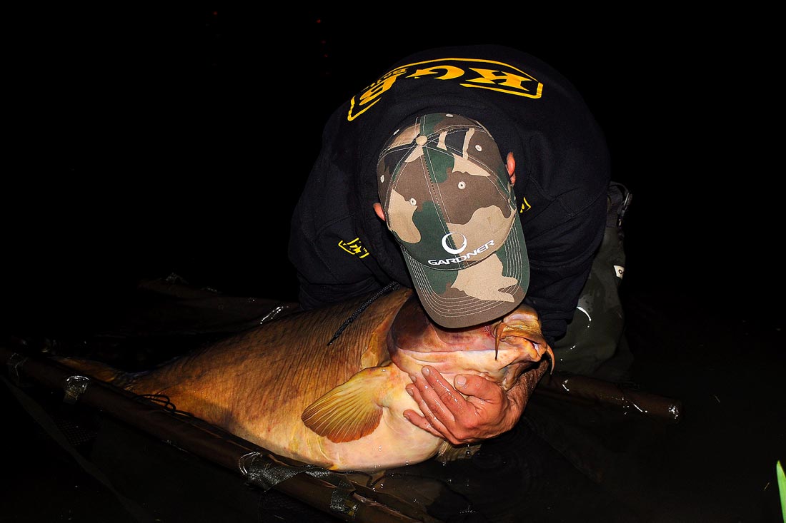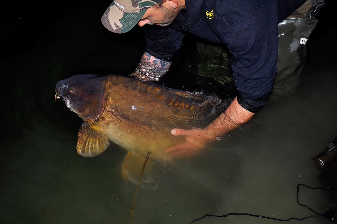 Ik laat hem vanuit mijn net in de weegsling glijden en hang hem aan de unster…. Ik controleer nog een paar keer door de zak er op en af te halen…. Kan toch niet……. Wouter checkt het nog eens en jawel … de brute 50ger waar ik 1,5 jaar geleden iets van gehoord had ligt hier verdomme in levende lijve op mijn mat.