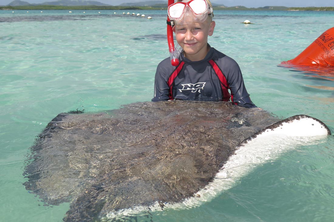 Another first this year was hooking Barry the 5 foot barracuda whilst on a family holiday. He lived under the jetty, and never moved far, as when the boats returned he would always get some sort of meal. He was clever though, and I managed to capture him brilliantly on film on the Go Pro one day, however in an attempt to get closer footage and whilst stretching out with the pole, I lost my footing and fell in, almost on top of him. Never have I got out so fast, in something that resembled a scene from Jaws! However one day whilst playing a small Jack, out he shot from under the wood and devoured my catch, which snapped the line, and left me shaking. However there was a highlight of swimming with huge Stingrays, and my younger boy Matthew held one up for a photo like a carp trophy shot!