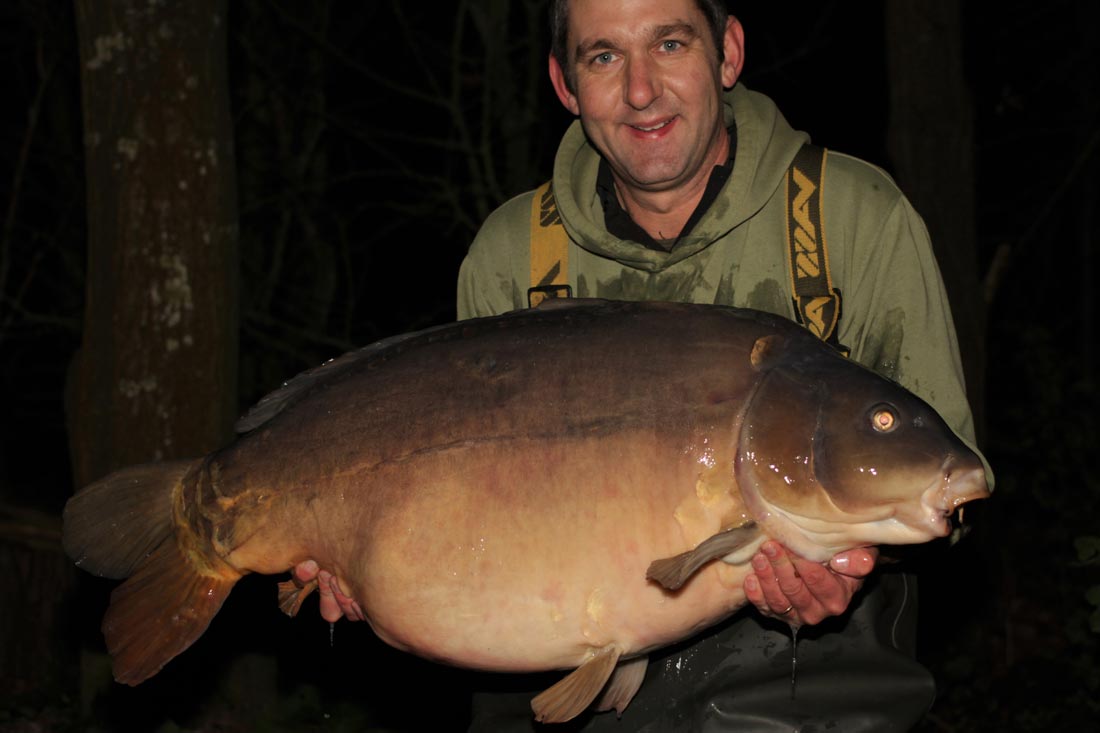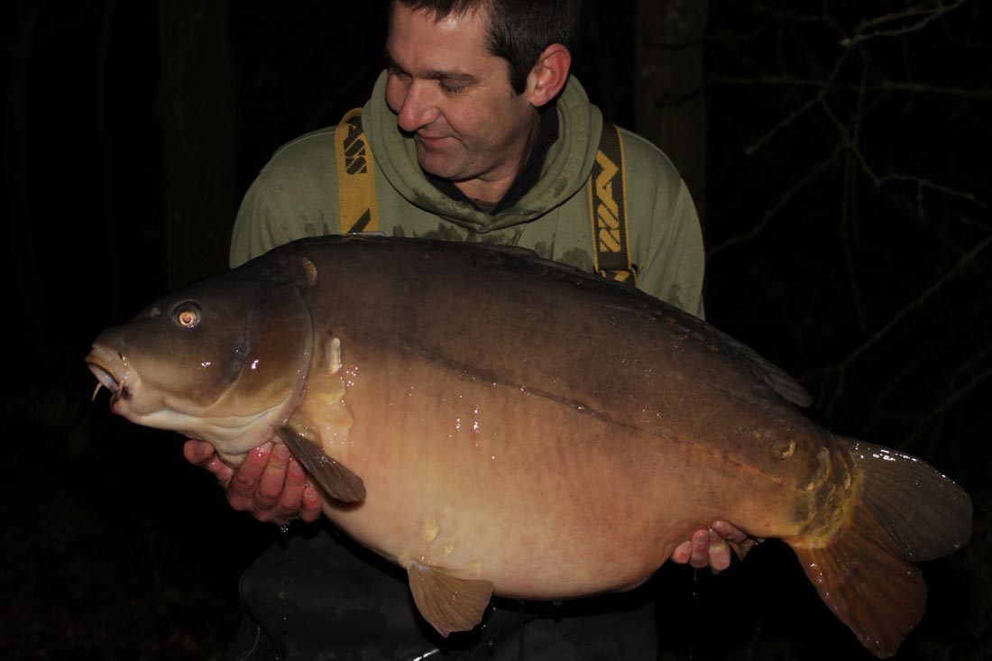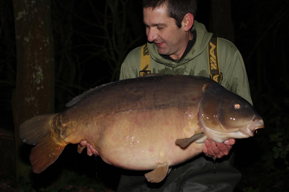 With only 2 other anglers braving the Sunday night on the pit, I came up trumps when Pete answered his phone and I blurted I had a monster in the net. Pete popped round a couple of minutes later to assist with the weighing and then the photography. We lifted her into the sling and hoisted her up, taking a couple of seconds to register what the scales said… “Errrrrrr 54…… 54 and a bit!” that on 120lb Reuben’s equates to 54lb 4oz.