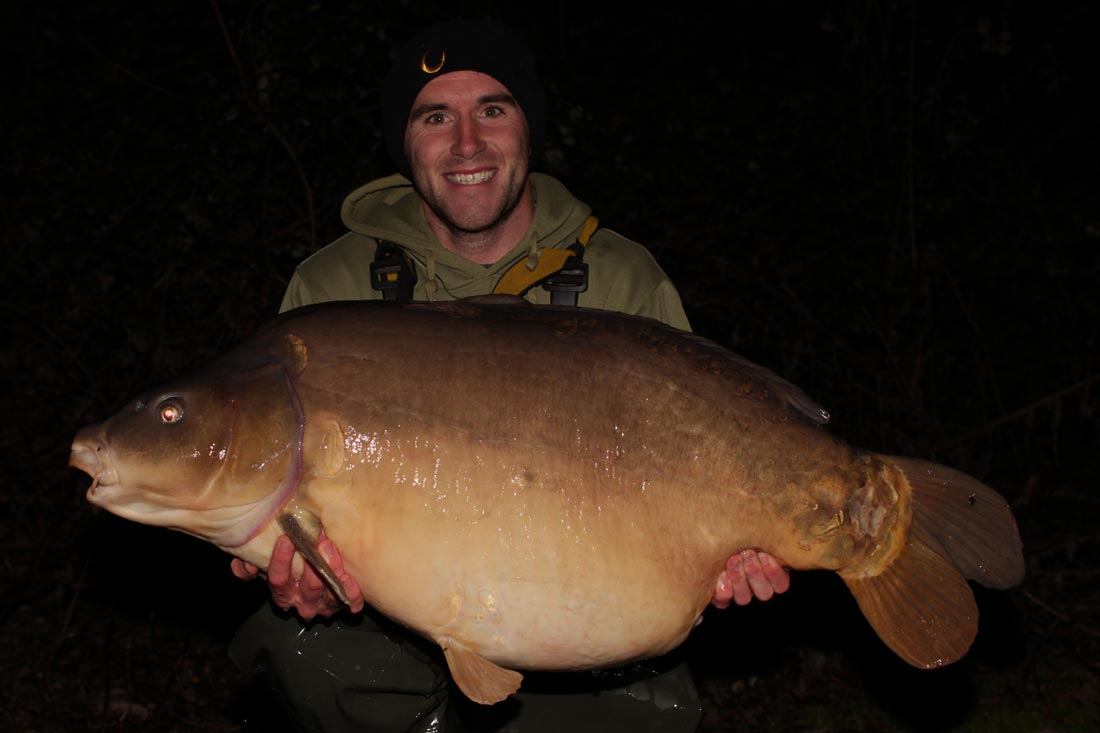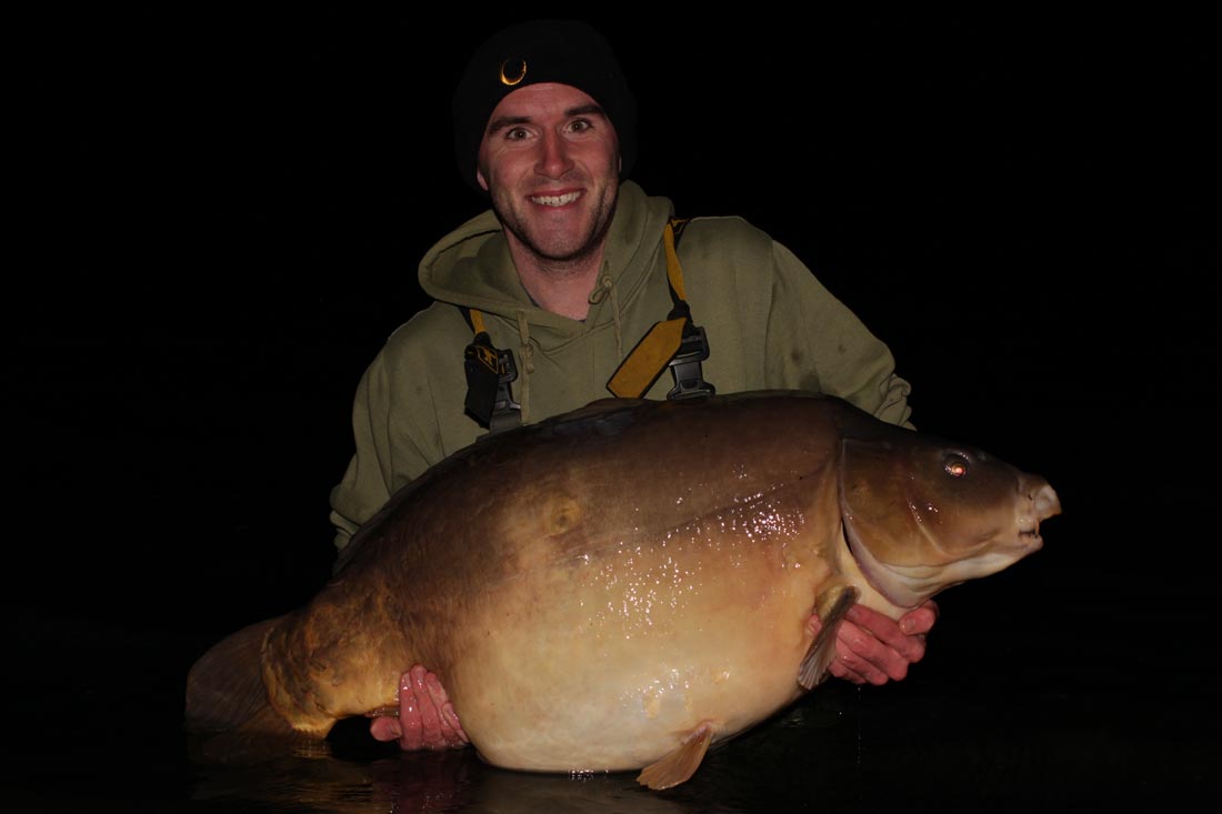 After dark the island rod was away and it felt like an eternity to get in. A little pink pop up on the Munnie rig was never in doubt to land this beast and eventually the huge frame of a mirror carp broke the surface in front of me. I immediately swooped with the net and the leviathan was sitting safely in the folds on the mesh. In the wind and spray it was hard to identify which fish it was, so I got everything prepped and tried to weigh it. It was at this point things got real and my poor little arms were wobbling all over the place with the needle frantically swaying around the 60lb mark. She was going to be a two man job, so I safely secured the fish and made a phone call to Lewis who was already on his way down to politely “hurry up” to help weigh and do the photos of this creature. A few of the other lads on the lake came round and helped to do the honours, which was handy because I was shaking and feeling sick with nerves at the sheer size of this carp. The final weigh-in revealed 59lb 8oz of February carp! An afternoon brace of over 100lb of phenomenal fish from an equally phenomenal venue.