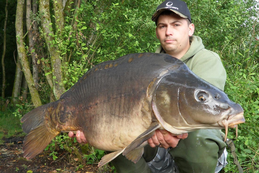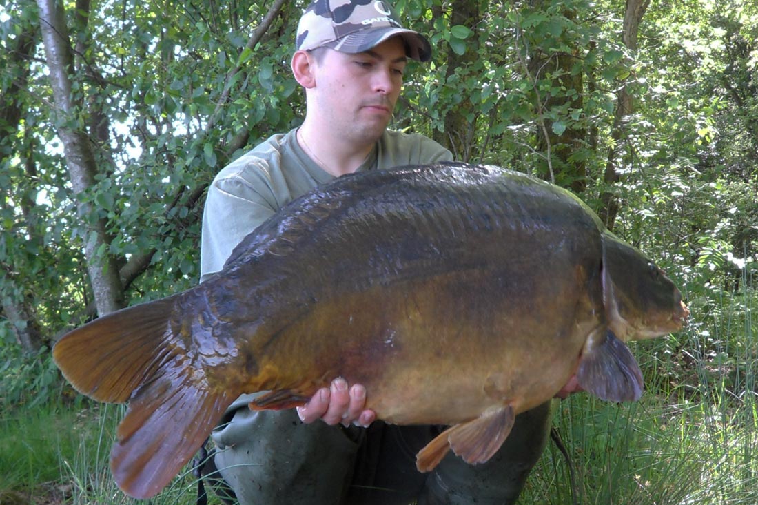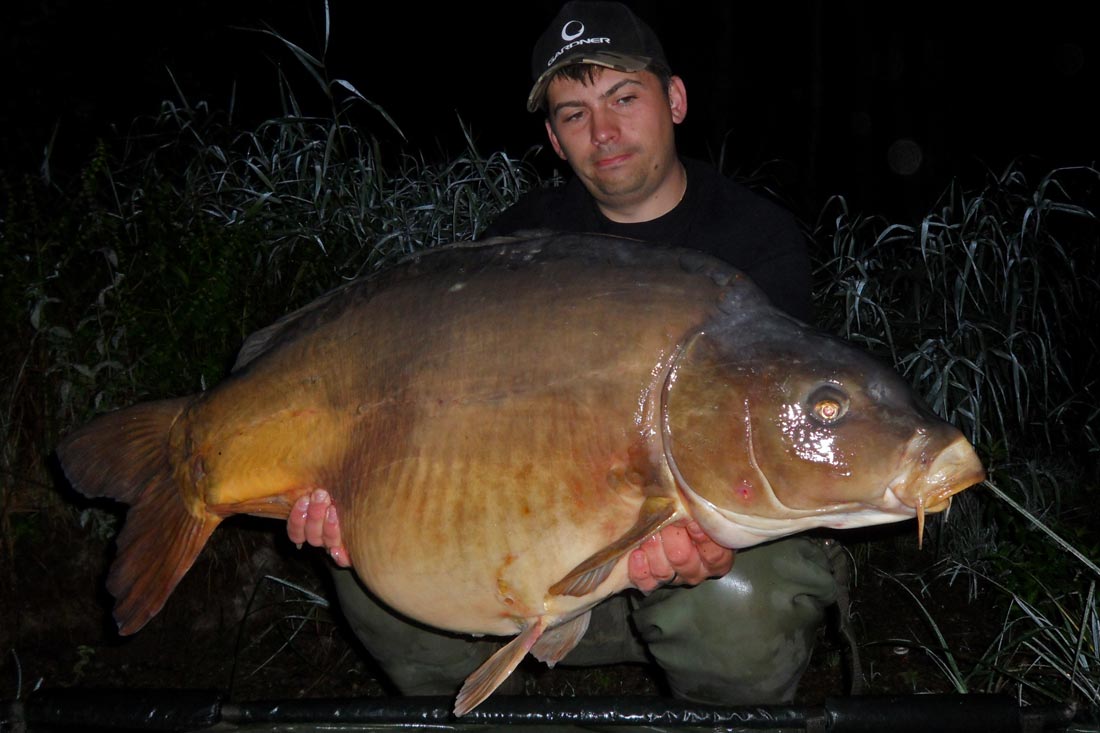 Doch s’ochtends rond 07.00 uur kreeg ik een snoeiharde run op mijn rechtse hengel, deze met het boeisysteem. Ik spurtte uit de tent en kwam tot de constatatie dat er een roeiboot in mijn hengel was verstrikt geraakt. Met het nodige gevloek besluit ik mijn 2 hengels uit te draaien met het boeisysteem. Dit omdat ik uit ervaring wist dat het een echt nachtwater was. Daarom besloten we alles op te ruimen en ons kamp op te breken. Net wanneer ik aan de hengel kom om deze binnen te draaien, krijg ik 3 biepen en zie ik de top plooien. Ik sla meteen aan maar ik voel niets. Ik spring snel de boot in, maar ik voelde nog steeds niets. Omdat er al aardig wat wier in de lijn geraakt was, moest ik deze constant verwijderen. Plots was alles los en voelde ik een enorme dreun die mijn 10-voeter tot in het handvat deed plooien. Na een dril van 20 minuten zag ik een zwarte schim uit de diepte komen. Een mooie, donkere spiegel van 15,6 kg. Mijn sessie was geslaagd en we keerden huiswaarts. Tijdens de terugrit besefte ik goed moest ik eerst de hengels binnengehaald hebben dat dit uitgedraaid was tot een blank; Dit was dus een laatste 5-minuten-vis.