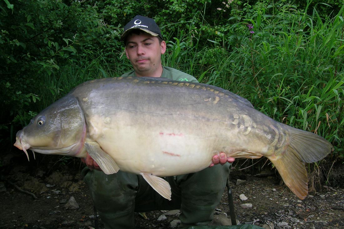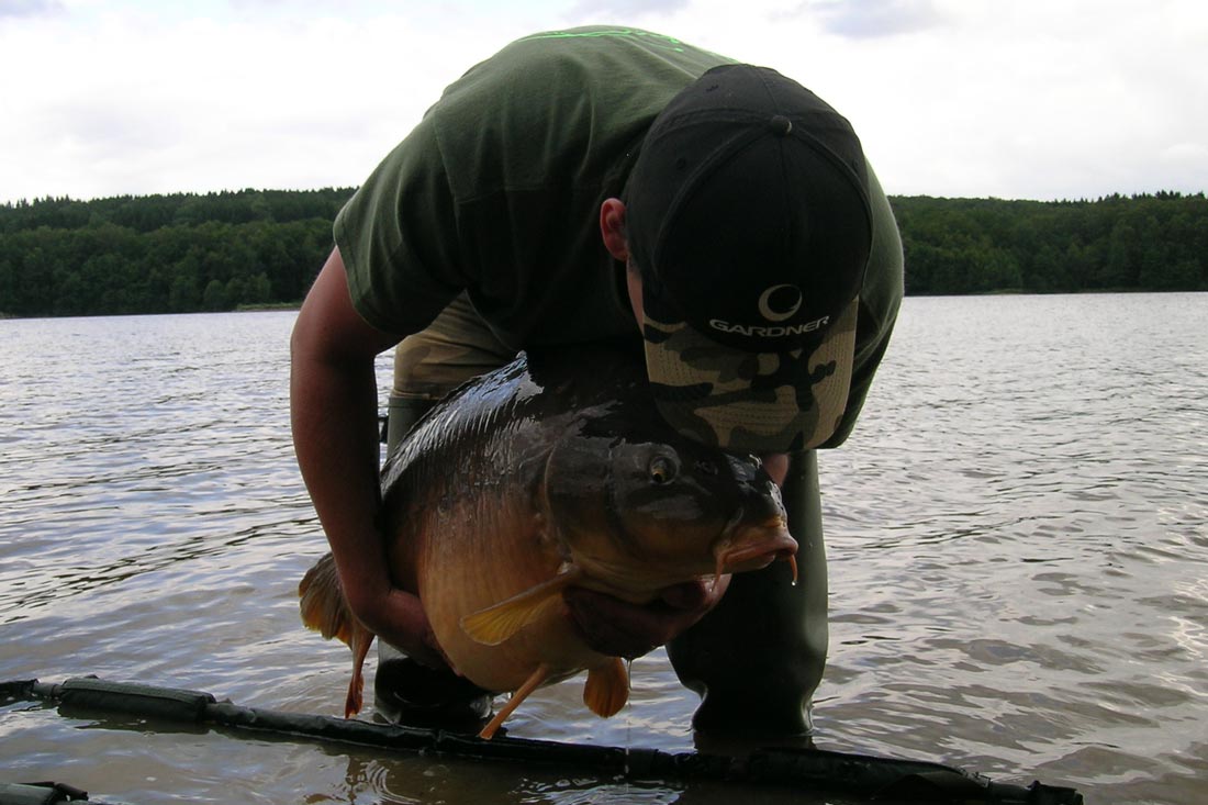 Het weekend van 15 augustus zaten we er terug met het gezin. Helaas waren de weergoden ons niet goed gezind en de regen viel met bakken uit de lucht. We besloten een kort nachtje te vissen, helaas was er geen karperactiviteit. Enkel de meervallen waren goed los. We besloten dus eind augustus nog een sessie te doen en mijn collega Bjorn zou dan ook terug meekomen. Opnieuw hadden we het geluk dat de stek van onze vorige gezamelijke sessie vrij was. De stekkeuze was dan ook snel gemaakt. Bjorns hengels liggen maximum 1 uur in als zijn 1 ste vis, een mooi schubje, al een feit is? S’Nachts volgde er nog een meerval en een klein karpertje van ongeveer 5 kg voor hem. Op mijn hengels blijft het stil. Omstreeks 05.00 uur loopt mijn buurman zijn hengel opnieuw af. Alles zit potvast en we besluiten samen in de boot te gaan omdat hij niet over de nodige bootervaring beschikt. Eenmaal boven de vis gekomen bleek deze goed vast te zitten tussen een boomstronk. Ik neem even de leiding over, pak de hengel vast en bevrijd de vis tussen de obstakels. Eenmaal de vis los, weer in veilig open water zwom en zo goed als boven kwam zag ik onmiddellijk dat het een 20kg-plus-vis was. Dolgelukkig gingen we naar de kant. Eenmaal gewogen klopte mijn vermoeden: een spiegel van 20,2 kg! Wat een prachtige vis! Na zijn eerdere 2 blanks had hij een welverdiende en een mooie vis van formaat op de kant. Kort nadat zijn vis was gewogen liep mijn middelste hengel af, die op circa 300 meter uit de kant lag. De dril verliep vlekkeloos en al snel kwam ik op de kant met een lage dertiger. Eenmaal ik deze vis met zijn 15,3 kg op de mat zag, oogde deze eerder klein in vergelijking met Bjorns veertiger. Zoals beloofd mocht mijn vrouw op de foto en had ze haar eerste karper vast. Ik ving daarna nog enkele vissen van een kleiner formaat en natuurlijk enkele meervallen. Sessie geslaagd en iedereen gelukkig.