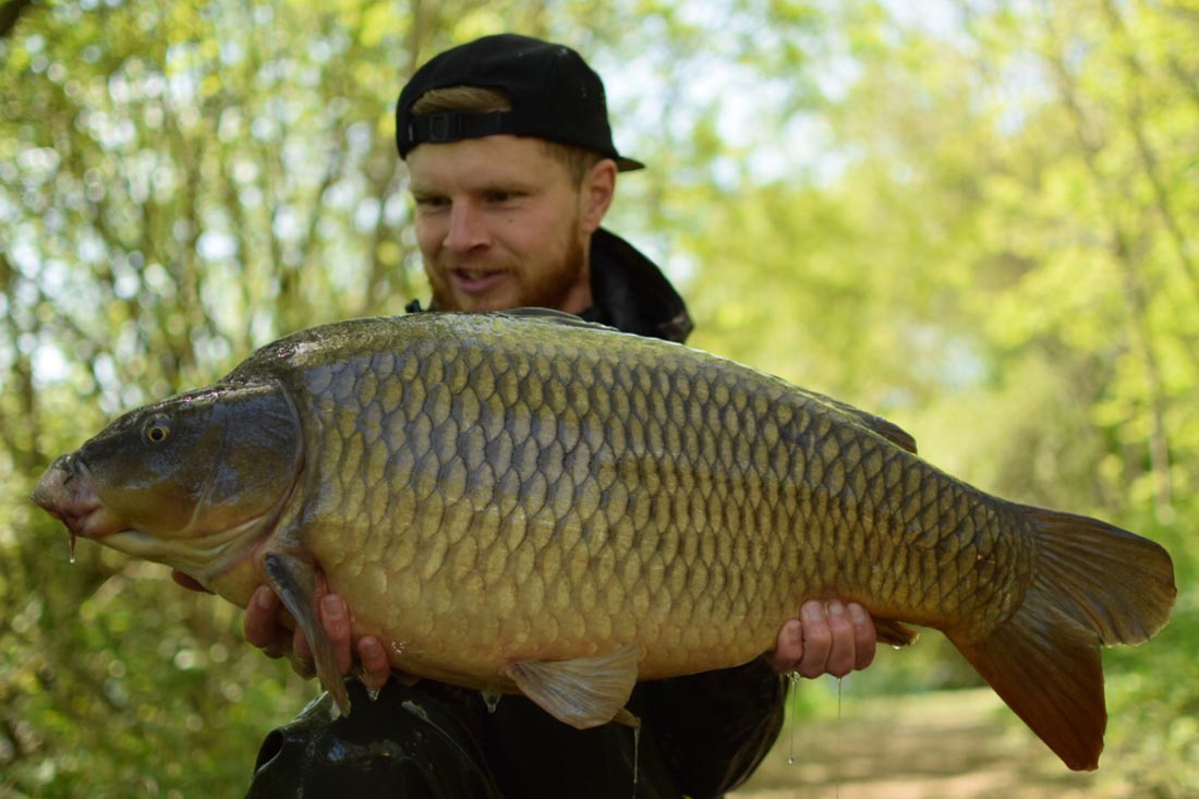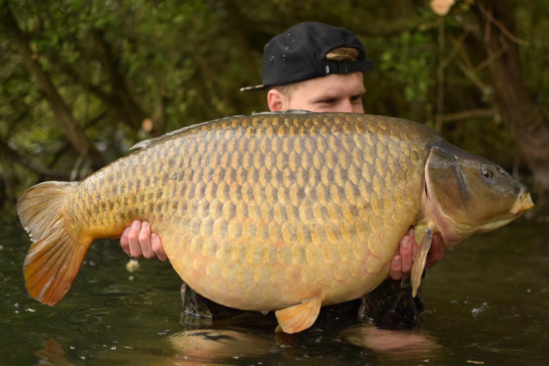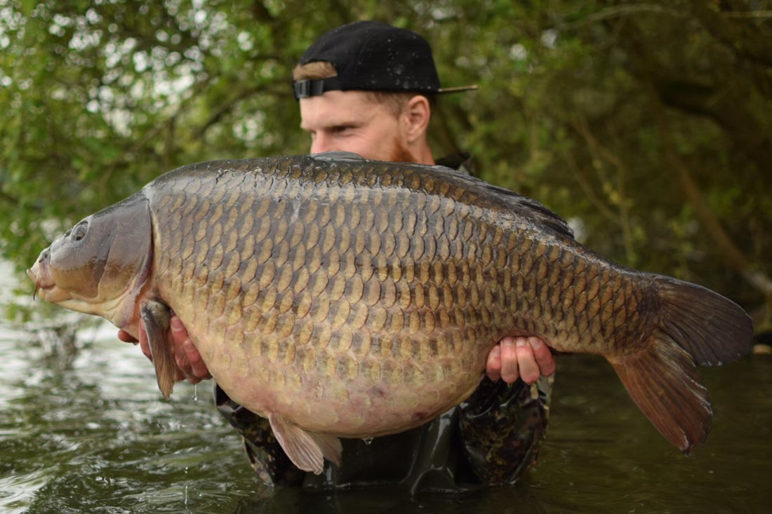 With that rod out I decided to set up camp and watch the water for any further shows for my other 2 rods. About half an hour into setting up the bobbin on the single rod slowly lifted up bleep my bleep and I was in already! With which felt like a tench bite at first, before I knew it the fish was swimming towards me at some speed. A massive common flanked up under my rod tips and then went made some big powerful runs straight back to the middle of the lake! I was straight in the waders and out in the water at full depth scooping A huge common in the net.