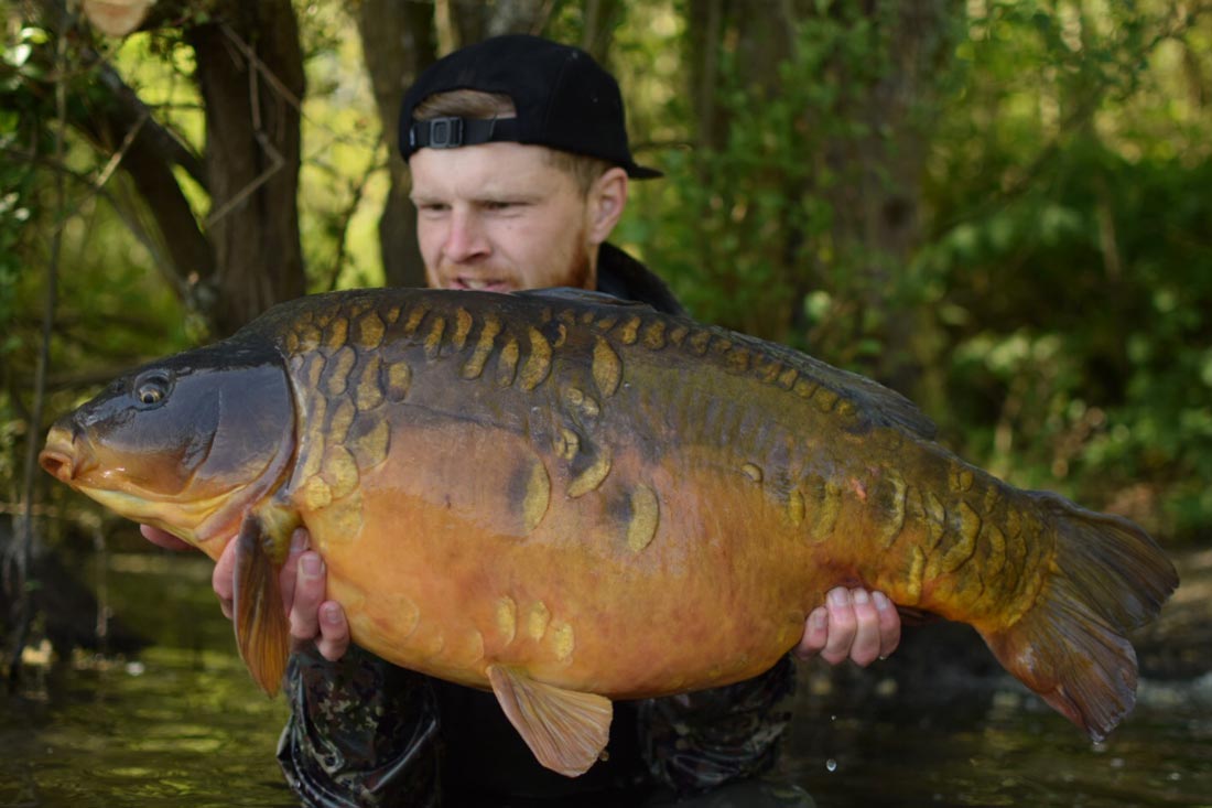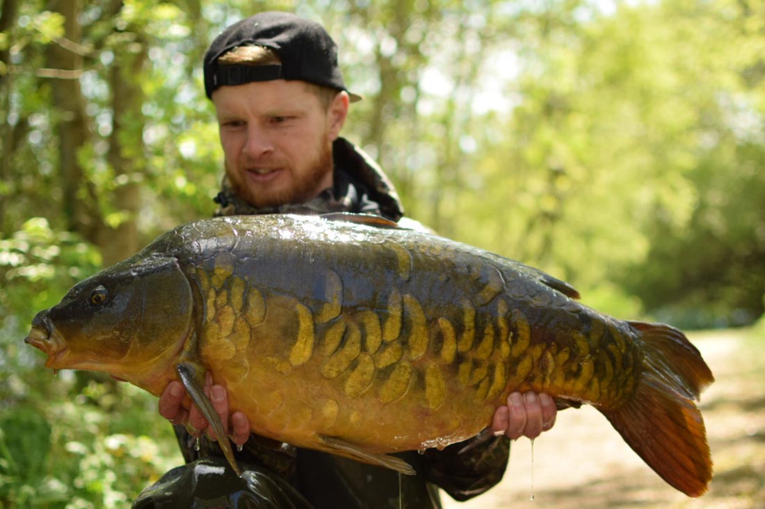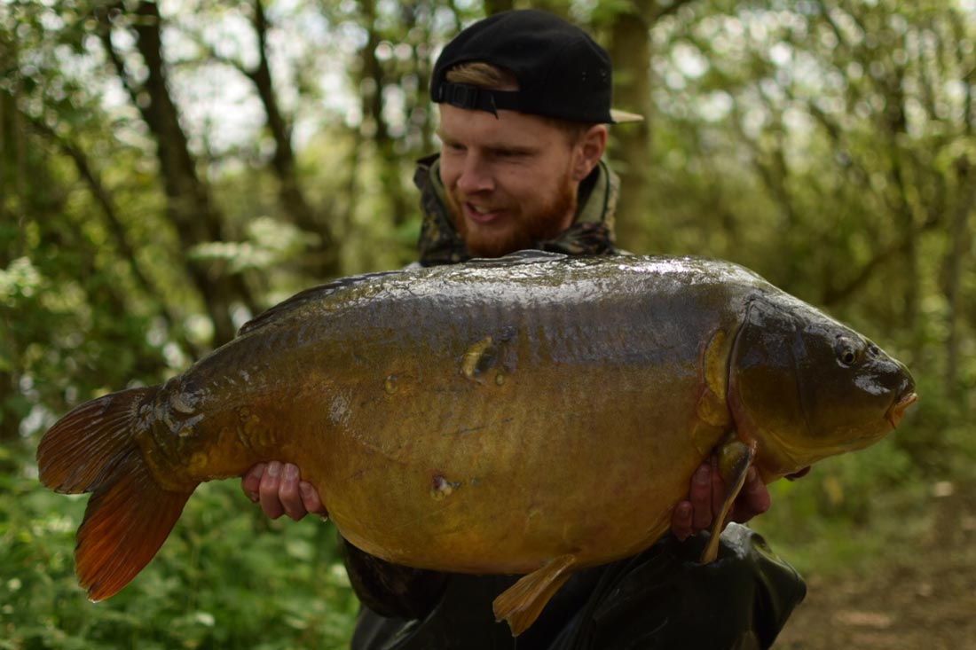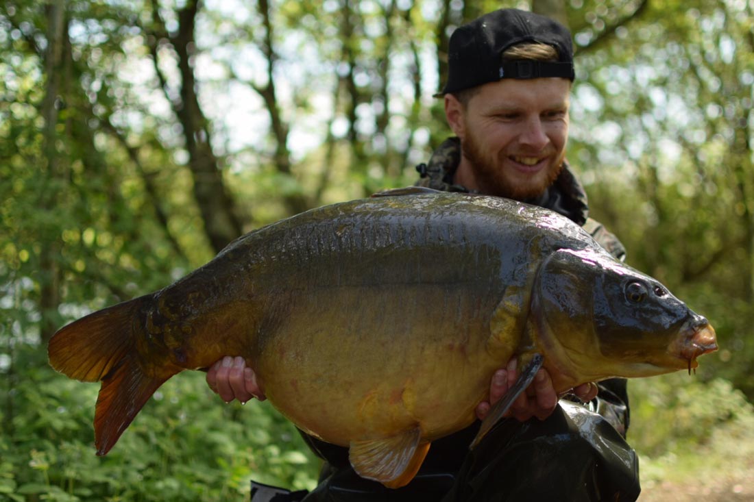 I was convinced this was it for the trip and with photos done at first light in the morning, I was just about to take the bivvy down, with just the rods to reel in and the unhooking Matt to dry off when the rod tip on the middle rod bounced and I was into my 15th fish of the trip. This was by far the craziest battle of the trip and the fish stayed really deep in the water and was such a heavy lump to move. It really didn’t help that it was taking me from weed bed to weed bed and after a half hour battle, I soon had an enormous hard fighting mirror in the net. After having a quick glance into the net, I noticed that the fish was very long and it was one of the three mirrors that swam around in this immense lake. It was a fish that hadn’t been out in ages, well over a year called The Nutsey Mirror at 40lb 4oz! It was my third forty of the trip in just 5 nights fishing. I even managed to get my mate Josh a guest and smash his pb twice from 32lb right up to this first ever 40lb carp! It was a trip of a life time and the perfect timing for my week off.
