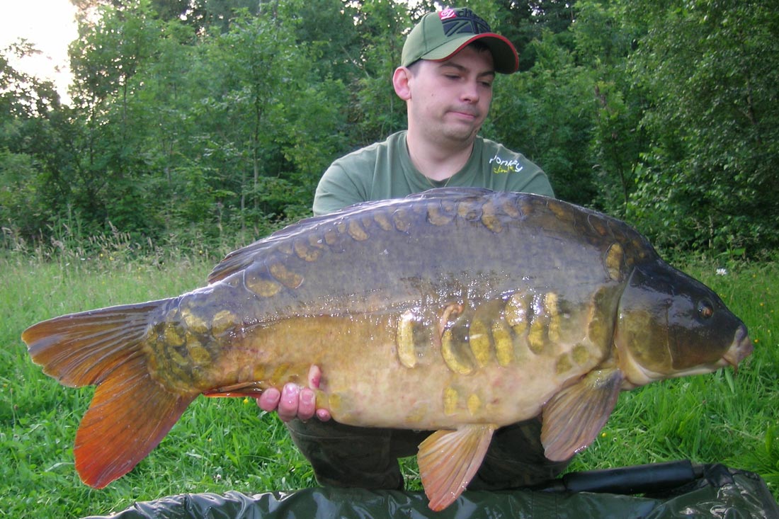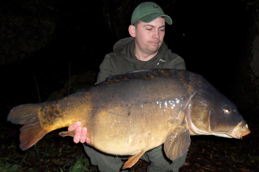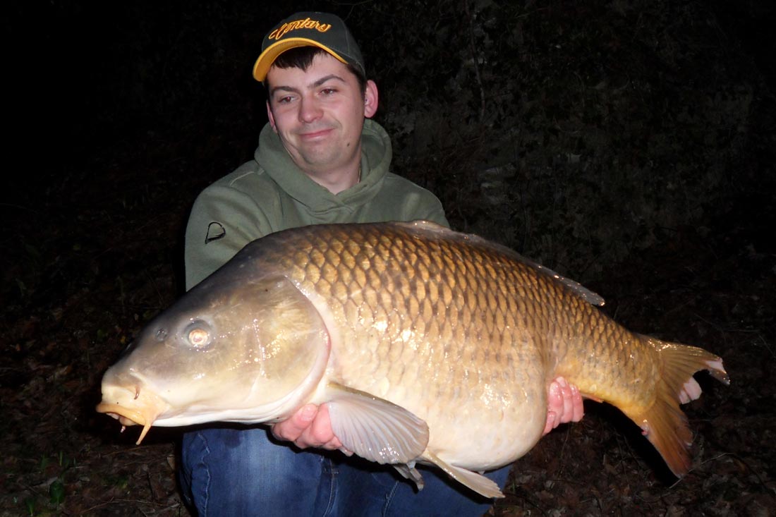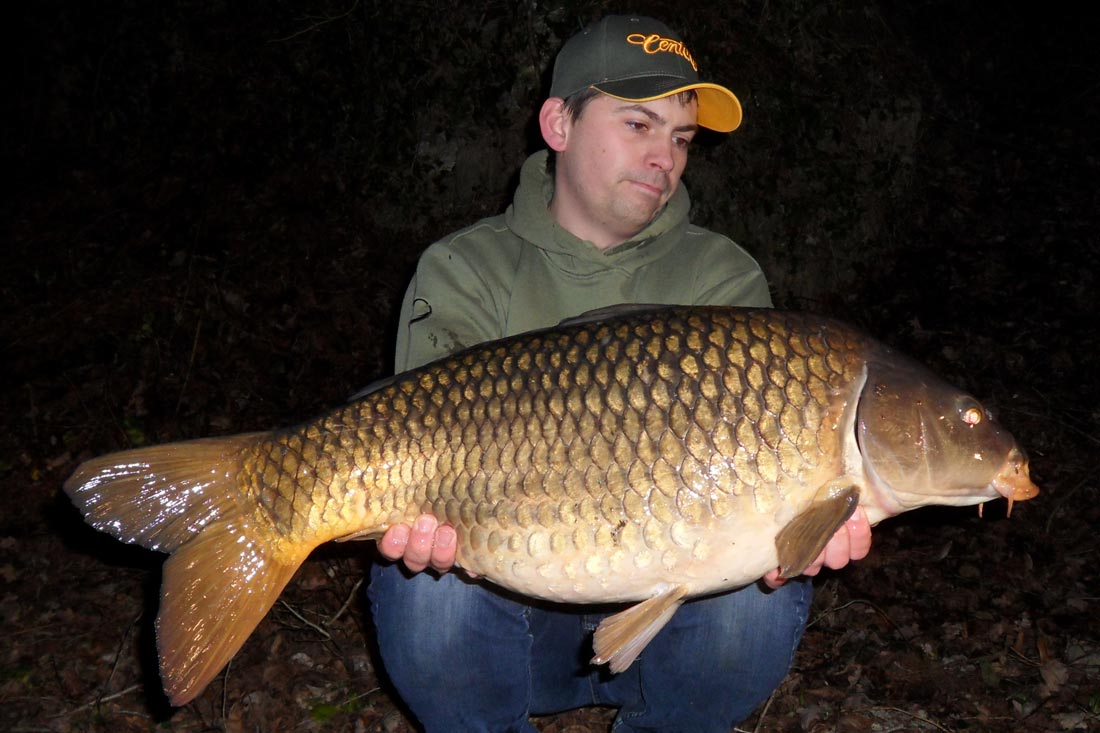 We Zijn al enkele weken later en we hebben al een aantal nachten aan het mooie kanaal vertoefd en… nou ja het is er niet altijd rozengeur en maneschijn. Ik heb er al een aantal blanks opzitten wat natuurlijk normaal is rond deze tijd van het jaar, het is dan ook winter. Toch heb ik tussen de blanks al enkele mooie vissen weten te verschalken enkele mooie schubkarpers en dit in stormachtige condities. Ik dien daarbij wel te vermelden dat ik om de 2 dagen mijn stek onderhield met klein aas, partikels en 16mm boilietjes. Het onderhouden van de stek is één van de sleutels tot succes! Tijdens één van mijn sessie besloot ik, na het bekijken van het 19 uur journaal en de weerkaart, onverwacht om vlug de spullen in de wagen te gooien en een nachtje te vissen. Natuurlijk had ik mijn trouwe viervoeter en vismakker dit al opgemerkt. Hij stond ook vlug klaar om even mee te gaan. Ik had thuis al wat voorbereidingen getroffen en mijn hairs al beaasd? De ene hengel met een uitgebalanceerd tijgernootje , gecombineerd met een PVA-netje van gecrunchte boilies en de andere met een 16mm boilie met een zelfgemaakt pop-upje. Dit om zeker niet te veel tijd te verliezen. Eenmaal aangekomen plaats ik terug één hengel in eigen kant met tijgernootje en de andere in de vaargeul in het midden van het kanaal. Ik plaatste een toploodje aan de hengels en legde mijn Century’s in mijn ATT’s. Na nog geen 20 min had ik al mijn eerste schub genet: een prachtige schub van 12kg. Twee uur later kreeg ik een volle fluiter op de hengel in de vaargeul, het gevecht breekt uit en een mooie schub door de 14kh wordt geland. Wat een gevecht, wat een flapper van een staartvin.