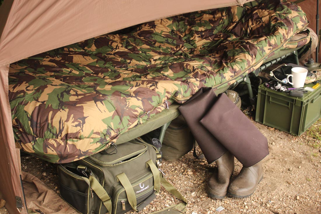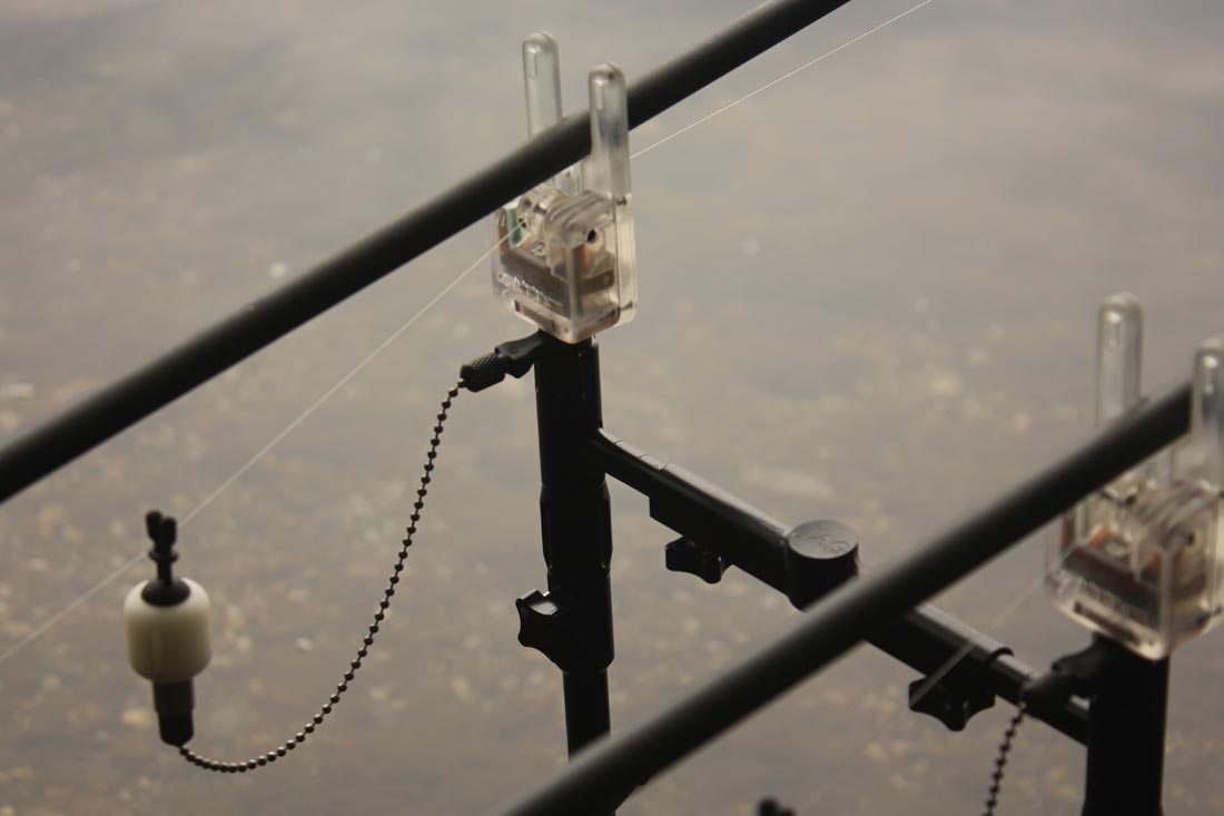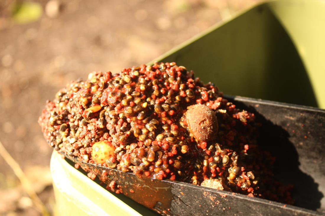 Mijn voorbereiding was eigenlijk heel simpel, aangezien het nogal ver vissen was van mijn stek naar het zwemstrandje moest er een waadpak mee om de rig goed uit te wandelen, ook het feit dat de stek bezaaid was met overhangende takken en struiken deed mij teruggrijpen naar sterk materiaal. Mijn rig werd opgebouwd uit Gardner Vigilante 35 lb materiaal, de haak mijn ouwe vertrouwde Continental Mugga in maatje 4, dit alles gevist aan een Gardner lood clip met een”gripper” lood van 170 gram. De bedoeling van zo zwaar op ondiep water te vissen is eigenlijk simpel, na de aanbeet wil ik het zware “prik” lood kwijt, en hoop ik dat de vis naar open water zwemt, indien dit plannetje mislukt heb ik nog altijd de Vigilante onderlijn in 35 lb en een backing van 10 meter Vigilante 45 lb op de molenspoel zitten als voorslag. In het slechtste geval boort de vis zich in de takkenjungle, maar doordat het daar zo ondiep is, kan ik er perfect naar toe waden en de vis toch landen. Een goede voorbereiding is het werk half gedaan. Wat me ook opviel tijdens het uitwandelen van mijn rigs, is dat sommige plaatsen een zachte bodem hadden en sommige plaatsen een echt harde bodem, ik besloot dan ook wat “marker” elastiek aan te brengen op mijn hoofdlijn met als idee die plaatsen later tijdens het uitwandelen, of uitvaren met de voerboot terug te kunnen identificeren, als zijnde “potentiële” hotspots. Over de voertactiek kan ik eigenlijk kort zijn, zwaar voeren werkt uit ondervinding totaal niet in “safe” zones, integendeel het werkt vaak compleet tegen je, en je verdrijft de vis als het ware uit een “safe” zone en je maakt er een grote “danger” zone van. De enige gangbare verklaring die ik hiervoor kan bedenken is eigenlijk heel simpel……een “safe” zone bevat geen massa”s boilies……enkel de “danger” zones bevatten die. De Crusher kwam weer tevoorschijn en boilies werden herleid tot kruim, deze mengde ik op hun beurt met kleine kgbbaits fast respons pellets en een flinke scheut Amino Aid moest de rest doen.
